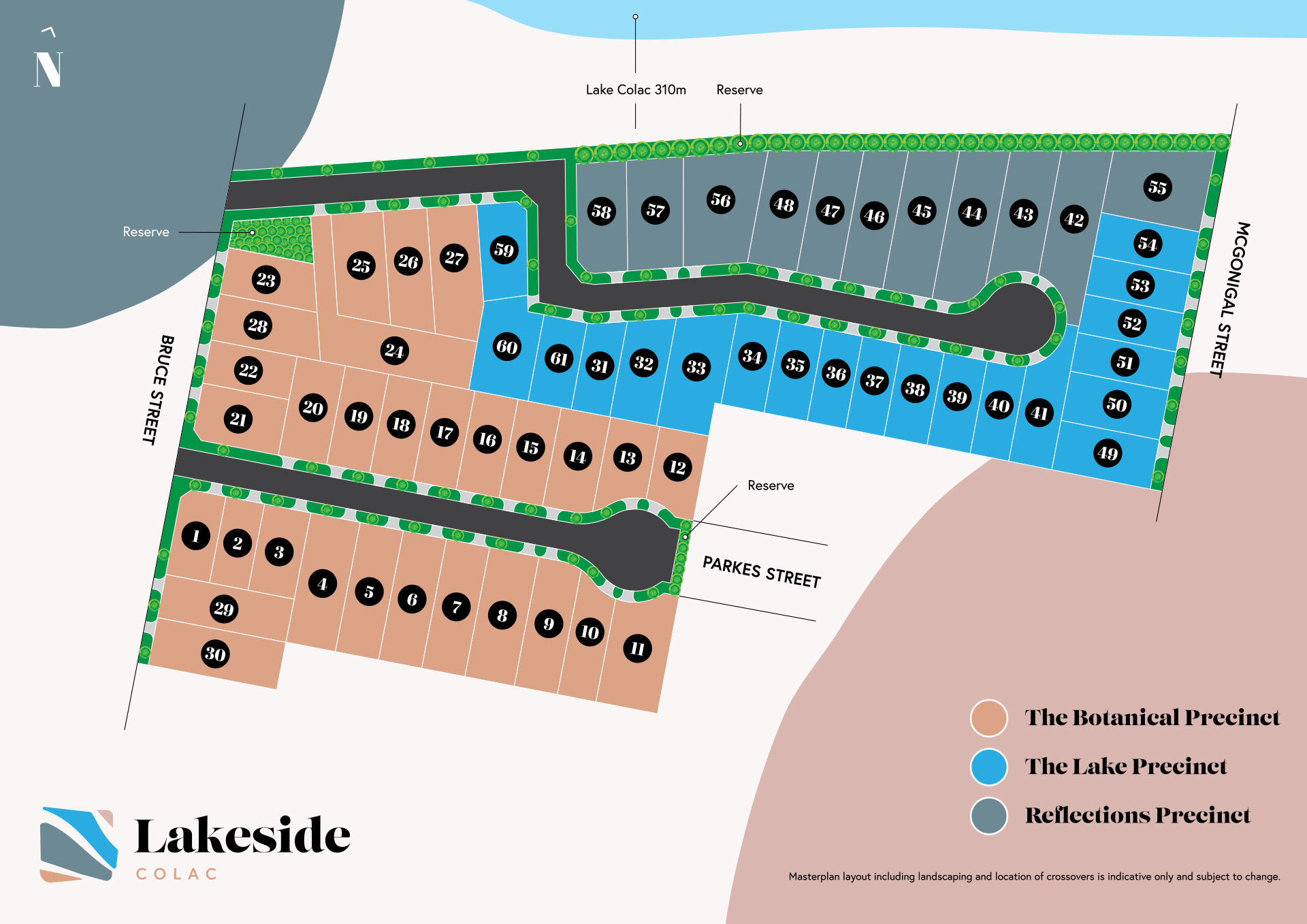 The Lakeside Colac website (the Website) has been produced to provide prospective purchasers with a general indication of the appearance and finished residential land subdivision within Lakeside Colac. The content and this Website have been produced for general information only. The images of Lakeside Colac and residential development contained on this Website are artist impressions and shown for illustrative purposes only. Further, the architectural impressions are based on the current designs for the development of Lakeside Colac Project. Changes will undoubtedly be made during development, and the amenities including dimensions, fittings, finishes and specifications are therefore subject to change.
